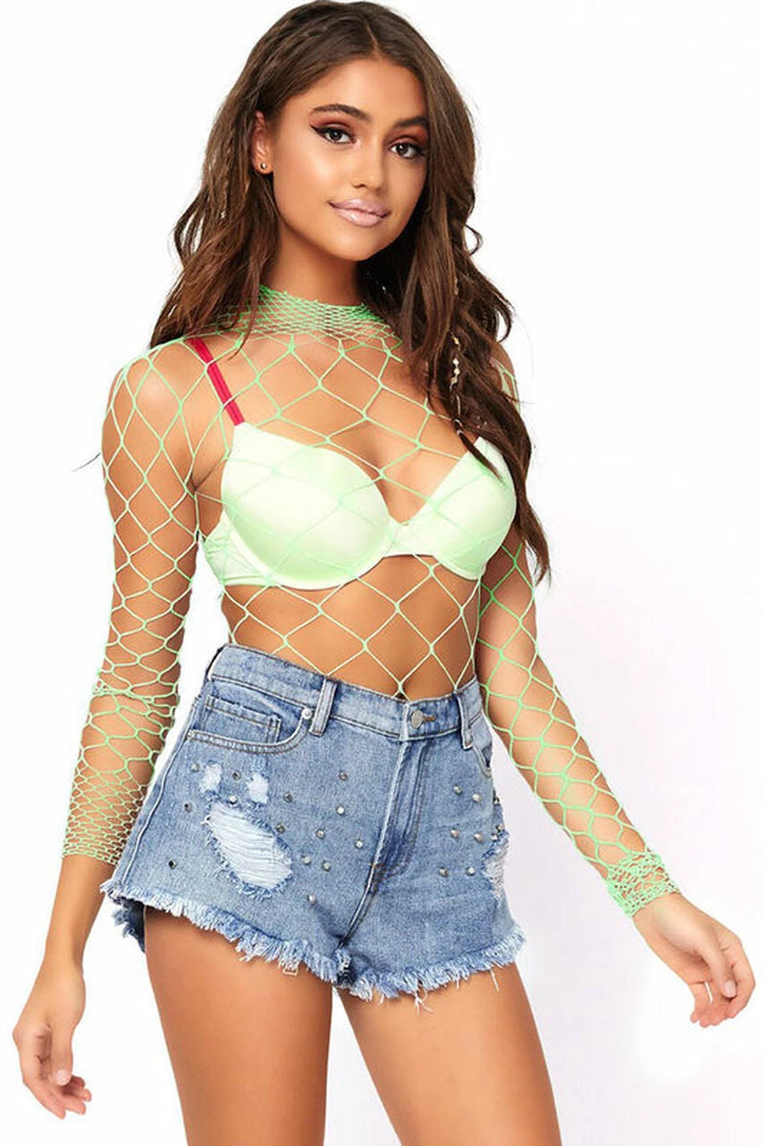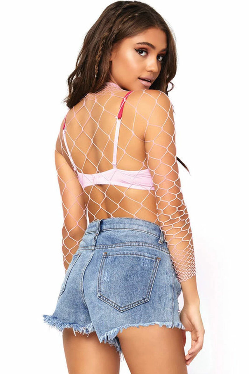 This wide, fence net bodysuit features long sleeves, a high neck, and a snap crotch thong panty.