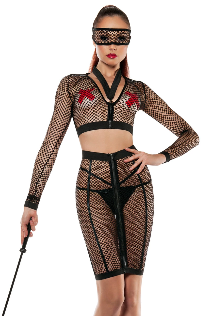 Play to your dominant hand in this Femdom Fishnet Dominatrix Outfit. This four piece outfit includes a micro fishnet long sleeve crop top with high waist fishnet skirt, g-string panty, and eye mask. Make an entrance training your latest submissive in this sexy dominatrix outfit or use your creative skills to turn this look into your own DIY costume.